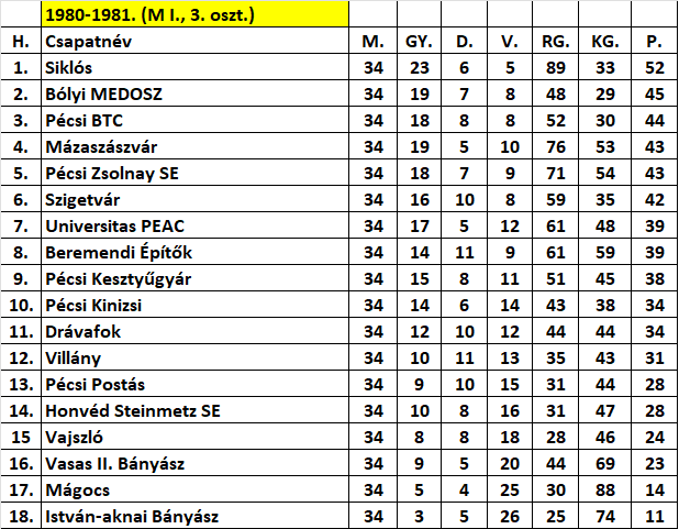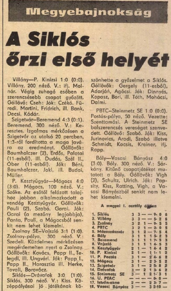 Mindent magának akart Csöre (4). Siklós–Steinmetz SE 4–0. Gyenge színvonal mellett is meggyőző volt a különbség a látogatók javára. István-aknai Bányász–Pécsi BTC 1–4. A vajszlóiak tervei ismeretlenek maradtak, a beremendieké kiderültek. Vajszló–Beremendi Építők 0–2. Gól nem esett, a többiről meg alig tudunk valamit. Pécsi Kinizsi–Szigetvár 0–0. Bár a szászváriak győztek, senkit sem emeltek tőlük, a Mágocsiak közül ellenben két embert is. A Mágocsnál Lippert, meg Kovács érdemelt dicséretet. Mázaszászvár–Mágocs 2–1. A vasasiak csak az első játékrészben tudtak felnőni a feladathoz, később már nem. Pécsi Kesztyűgyár–Vasas II. Bányász 3–1. Változó iram jellemezte a találkozón. Ezt aztán mindenki értse, ahogyan akarja! Pécsi Zsolnay SE– Universitas PEAC 0–0 (Dunántúli Napló, 1980. október 7.).