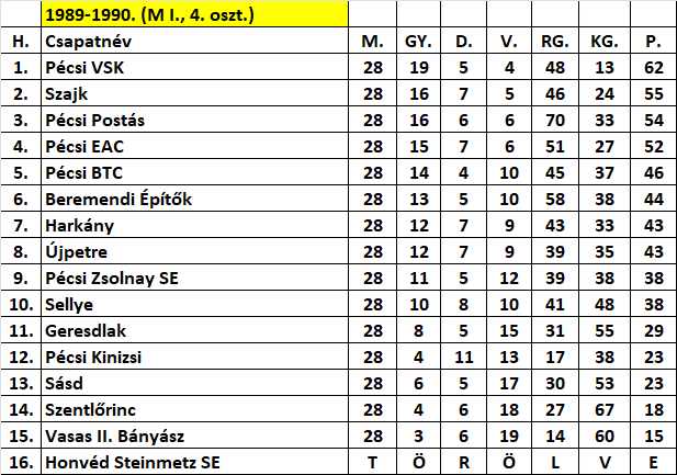 A Vasas II. Bányász–Pécsi BTC találkozó jelentette a nyitányt a megyei I. osztályú labdarúgásban. Ahol ettől kezdve a győzelemért három pont járt, a döntetlenért meg egy. A vereségért persze maradt a nulla. Azt viszont akkor még nem lehetett tudni, hogy a vasasiak végül kiesők lesznek majd. (Dunántúli Napló, 1989. augusztus 19.).