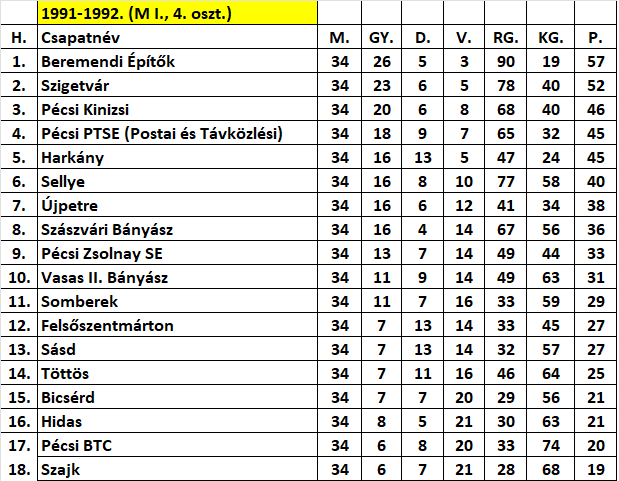 A beremendiek egy nyolcassal ünneplték bajnoki címüket, amihez jó társnak tűnt a bőrgyári ellenfél. Beremendi Építők–Pécsi BTC 8–0. Újpetrén kínlódtak a szajkiak egy „jót”. Újpetre–Szajk 5–0. A hazaiak sokáig játszottak tíz emberrel, de ment nekik. Kiállítva: Goják (Sellye). Sellye–Harkány 3–1 (Dunántúli Napló, 1992. június 1.).
