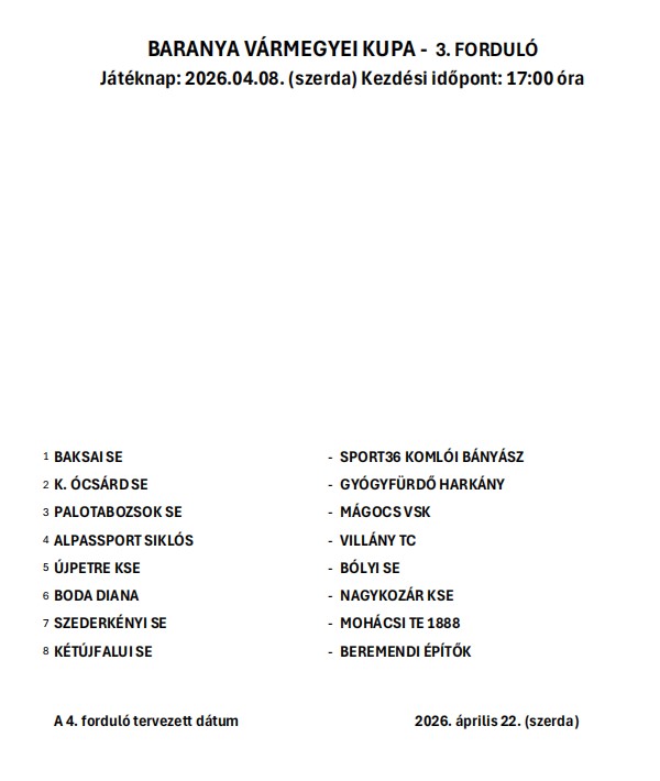 Az MLSZ Baranya Vármegyei Igazgatóságán hétfőn (03.23) kisorsoltuk a Baranya Vármegyei Kupa 2025-2026 évad 3. fordulójának mérkőzéseit.
