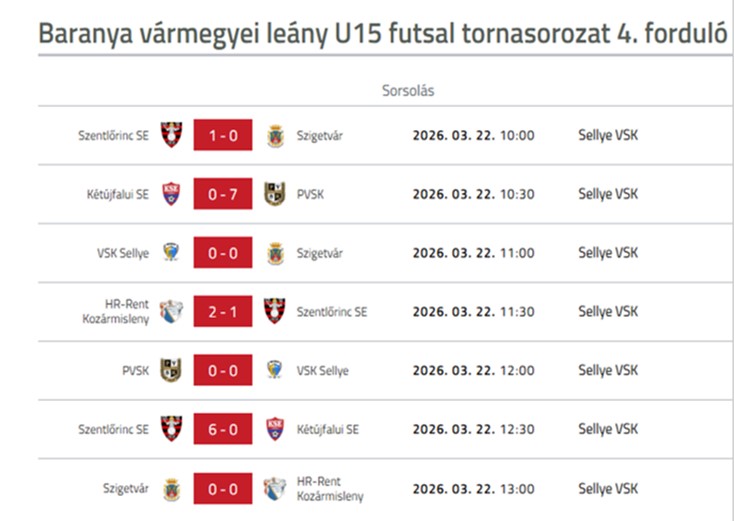 Vasárnap (március 22.) zárult a leány futsal U15 tornasorozat Sellyén. Az utolsó forduló nagyon izgalmasra sekeredett, hiszen az utolsó mérkőzésen dőlt el, hogy a tornasorozatot a Kozármisleny vagy a Szigetvár nyeri. A döntő mérkőzés nem hozott gólt, így a két pontos előnyét megtartva a kozármislenyiek örülhettek a végén. A többi résztvevő csapatnak is jár a gratuláció, nagyon izgalmas és élvezhető mérkőzéseket játszottak egymással a kilátogató nézők nagy örömére. A tornasorozat jól szolgálta a téli felkészülést a csapatok számára a tavaszi szezonra.
