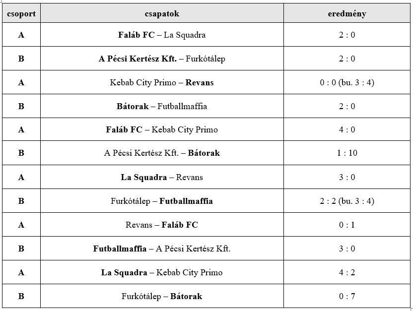 A csoport: Faláb FC, La Squadra, Kebab City Primo, Revans
