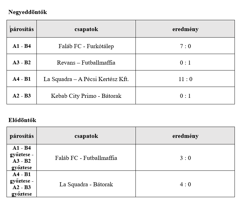 B csoport: A Pécsi Kertész Kft., Furkótálep, Bátorak, Futballmaffia